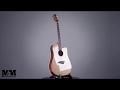 This guitar features a spruce top with natural gloss finish, a rosewood fret board, and a unique rosewood bridge. It also features a thin body, low profile dreadnought shape with cutaway, a 2 piece book matched top and back, full cream binding on body, neck, and headstock, and 20 frets. It comes with enclosed gold die-cast tuners, 2 gold strap pins, two extra pick guards, a polishing cloth, D'Addario strings, a 3-band active piezo pick-up system, and 9-volt battery. The guitar is a 25.5" scale with an overall length of 41", a body depth of 2-5/8", and 1 11/16th" (43mm) wide at nut. The guitar is covered by a 10 year limited warranty.
